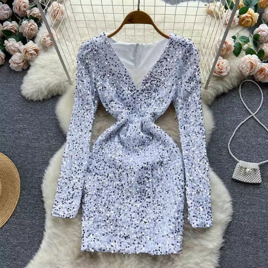 New sexy design sequined V-neck long-sleeved dress S4543