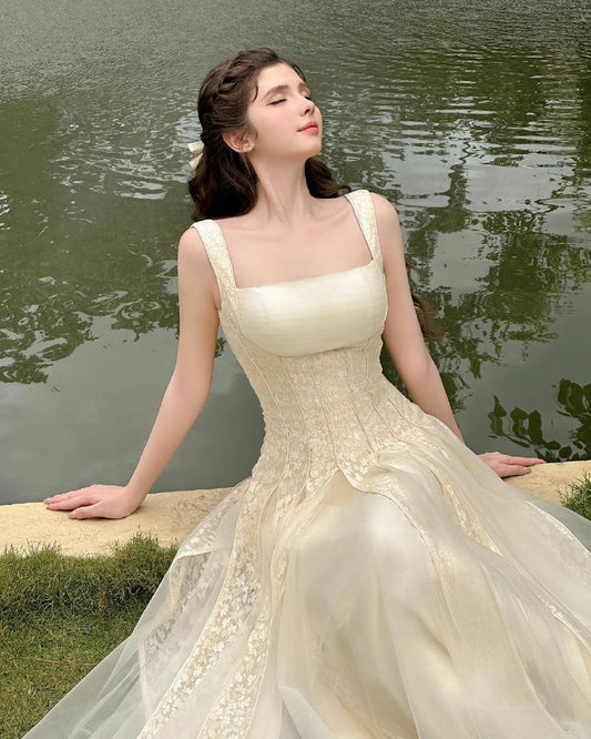 Apricot gentle sling waist slimming A-line long skirt homecoming dress R3623