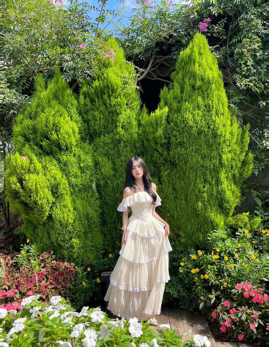 Apricot Off-the-shoulder Floral Waist Slim Fit A-line Long Ball Gown Bridal Gown R5857