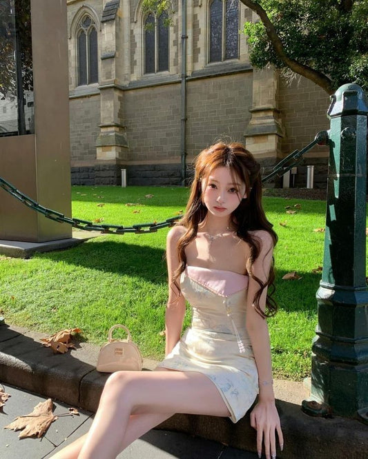Apricot short skirt pink tube top design waist slimming sexy short skirt homecoming dress R4061