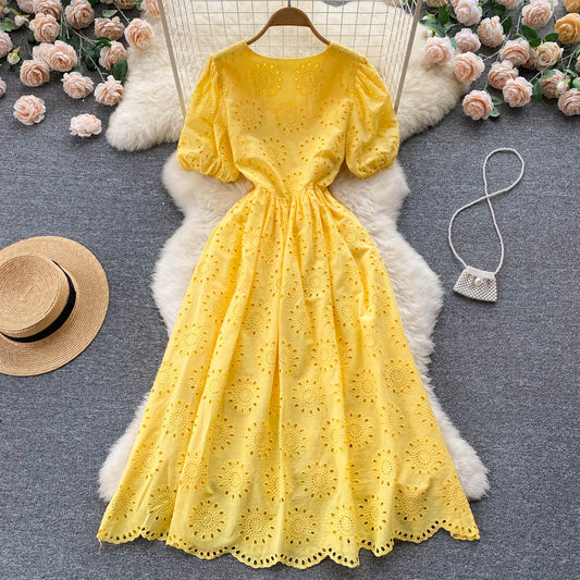 puff sleeves round neck A-line lace dress elegant long skirt S4262