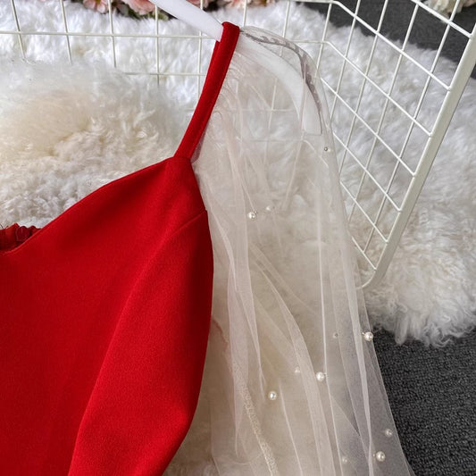 puff sleeve V-neck mesh beaded A-line mid-length dress S4090