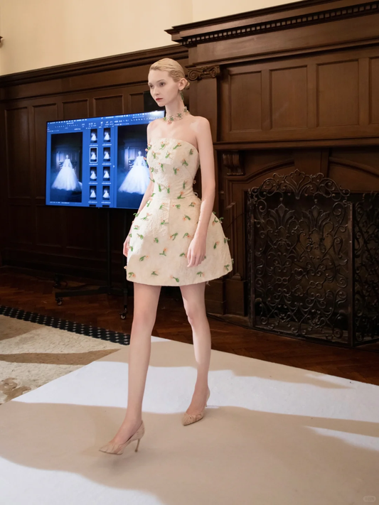 Apricot tube top three-dimensional flower waist slimming fairy beautiful short skirt homecoming dress R4292