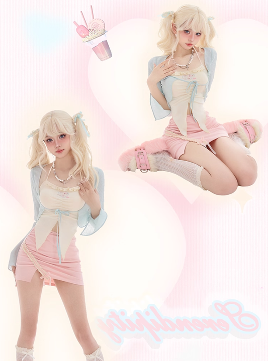 Pure desire style beige irregular camisole 2025 large size sweet hip skirt three-piece set R1335