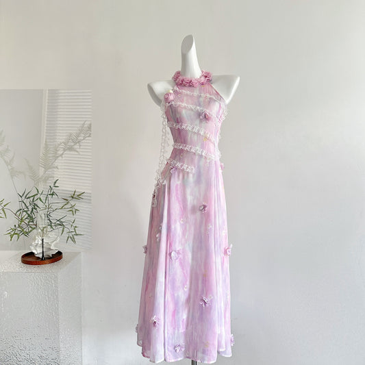 Purple long halter neck dress summer French retro slim fit temperament skirt R4623