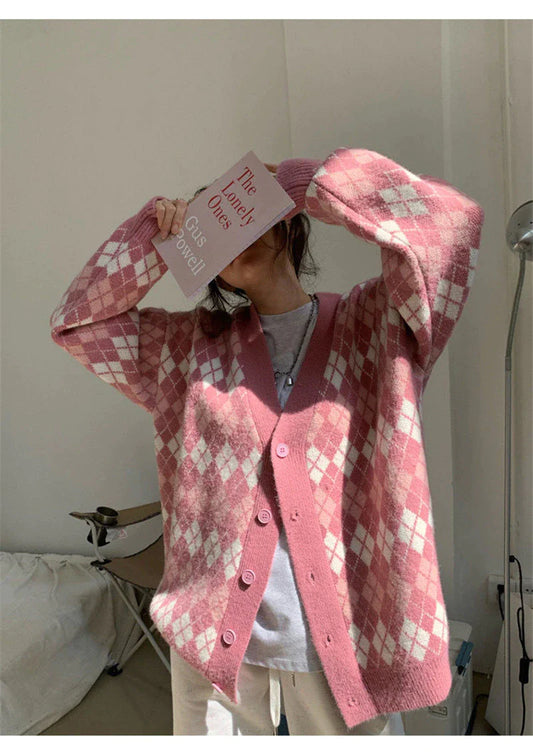 Argyle Pattern V-Neck Knitted Cardigan Sweater S2792