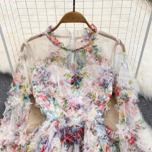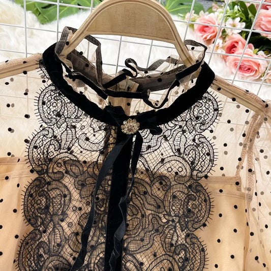 Autumn Bowknot Stand Collar Polka Dot Lace A Line Dress S4939