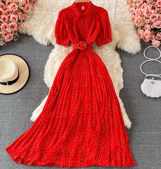 2025 Puff Sleeve Lapel Pleated Polka Dot Dress Waist Slimming Long Swing Dress Short Sleeve R0382