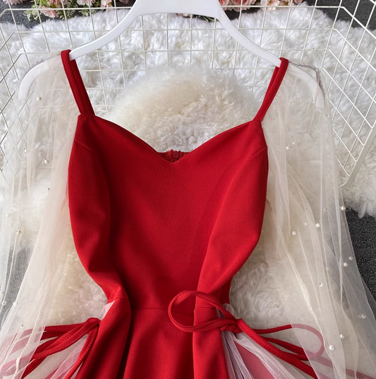 2025 new white irregular design short skirt holiday temperament red suspender dress R0087