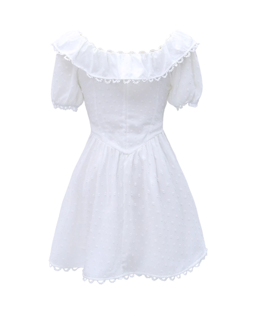 2025 new white short skirt women's French square neck puff sleeve dress waist slimming R0119