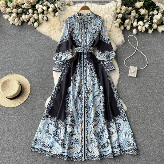Retro palace style goddess style single-breasted lapel print dress elegant A-line long skirt R0361
