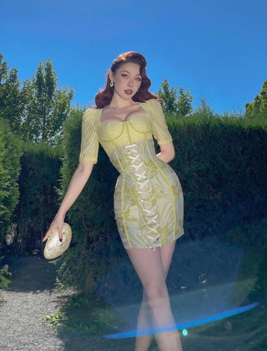 Retro light yellow waist slimming hip sexy short skirt homecoming dress R3063