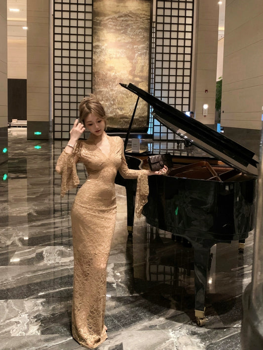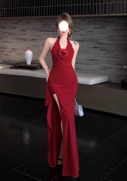 Retro red halter neck dress 2025 new hot girl sexy slit high waist hip long skirt R0036