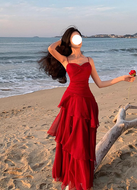 Retro red irregular ruffle sling dress 2025 new holiday temperament long dress R0042