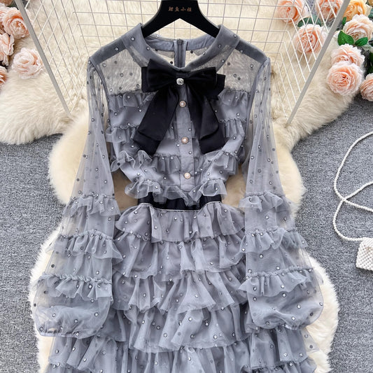 round neck bow diamond mesh dress for women sweet princess cake long dress S4638