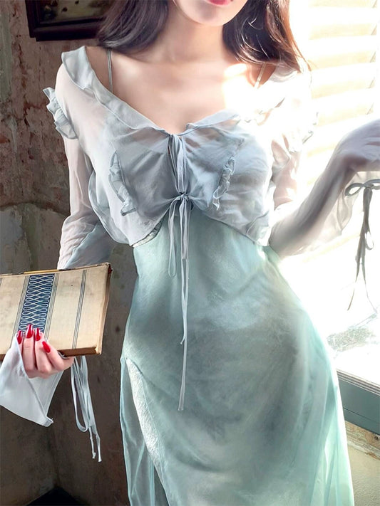 Ruffled Long evening Dress Women's Silk Cardigan Jacket S6056