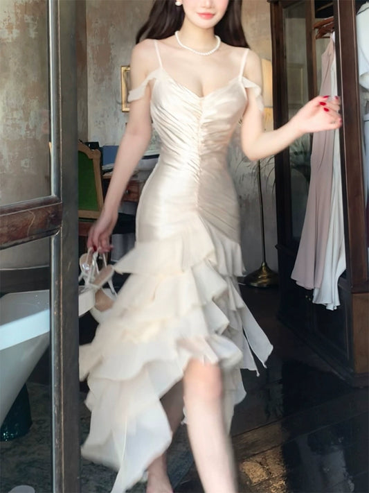 Ruffled polka dot suspender dress for women summer new irregular long party dress S5654