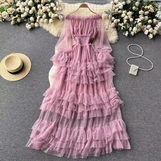 Ruffled One-line Neck Off-the-shoulder Holiday Dress S4455