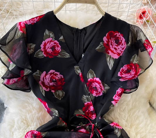 Ruffled Romantic Rose Suspender Dress French Retro Temperament Dress R4988