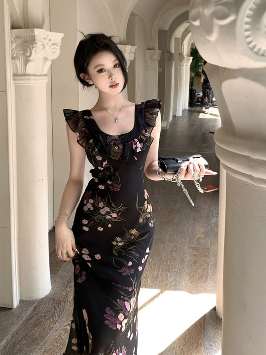 ruffled sleeves black floral dress summer long dress S5838