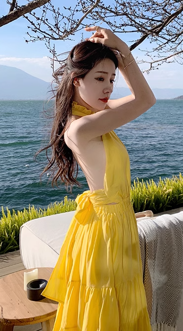 Beach holiday dress hides flesh and makes you look thin. Yellow backless French long skirt R0181