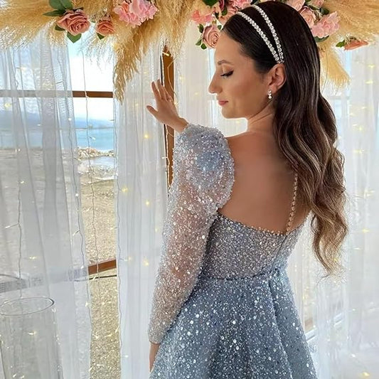 Shiny Sequin Ankle Length Prom Gowns Long Sleeve A Line Short Evening Party Dress for Women S5001