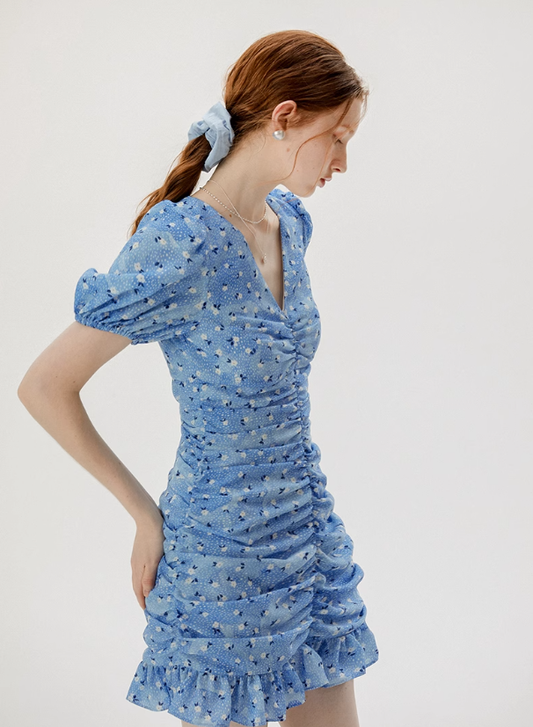 Short hip skirt summer French floral skirt blue petite pleated dress R2714