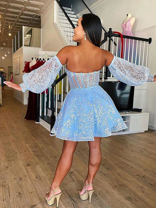 Short Light Blue Lace Prom Dresses, Light Blue Short Lace Formal Graduation Dresses S2615