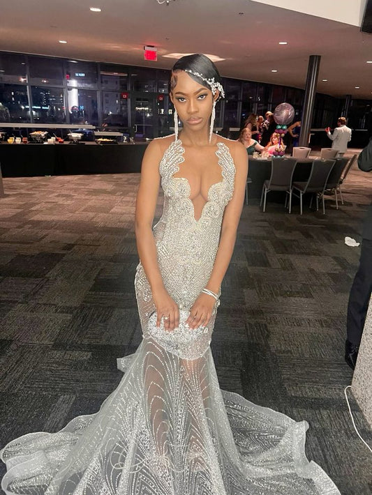 Silver Beaded Formal Dresses for Black Girl, Mermaid Long Prom Dress Evening Gown S6762