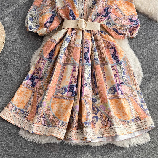 short-sleeved V-neck mid-length a-line printed dress S4291