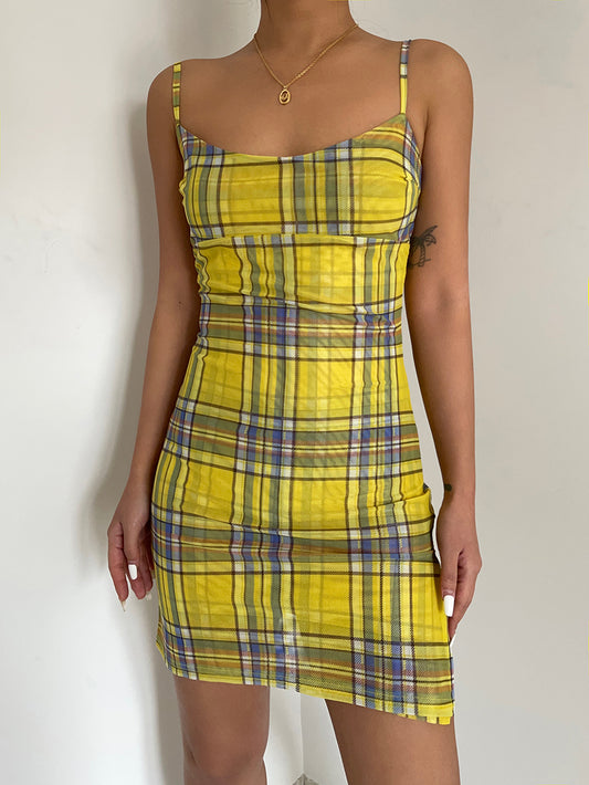 Show body American hot girl sexy yellow plaid soft a-line suspender skirt holiday dress R3033