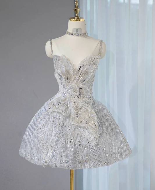 Silver strap diamond-studded high-end neckline waist puffy skirt short skirt homecoming dress R4159