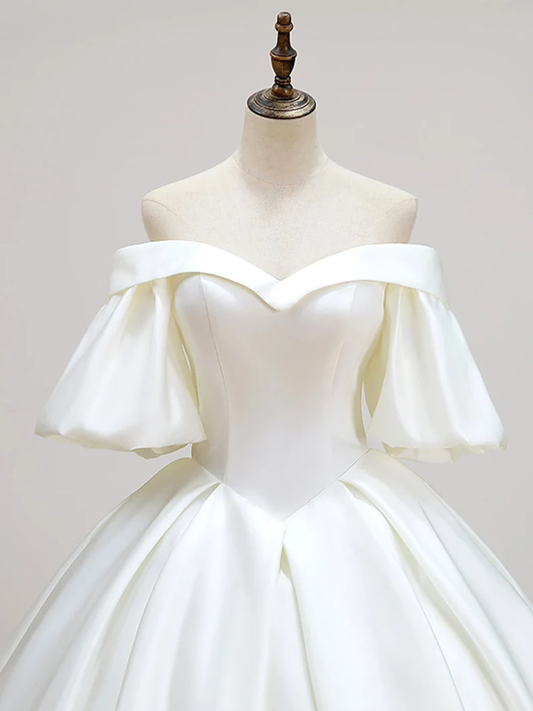 Simple Off-Shoulder Short Sleeves Wedding Dress Satin Chapel Train Ball Gown Bridal Dress S1935
