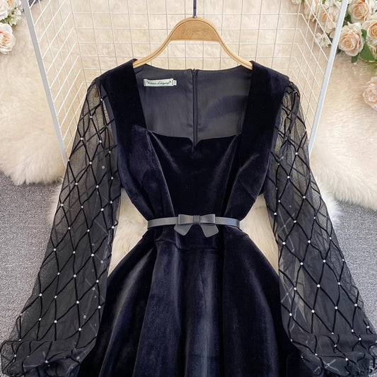 square neck dress hot girl pleated long-sleeved skirt S4571