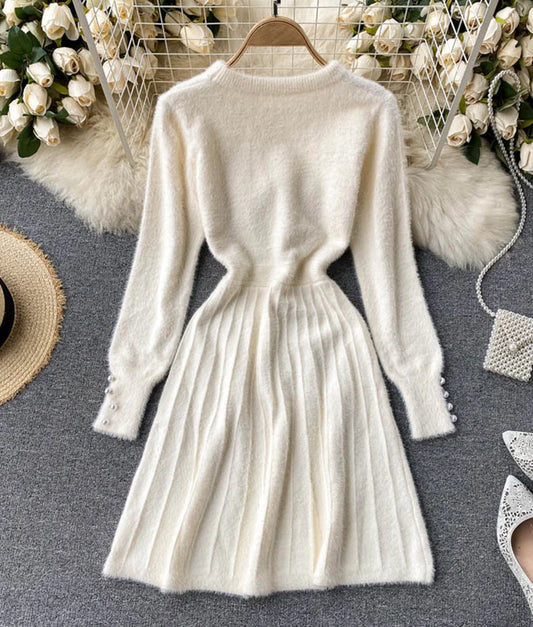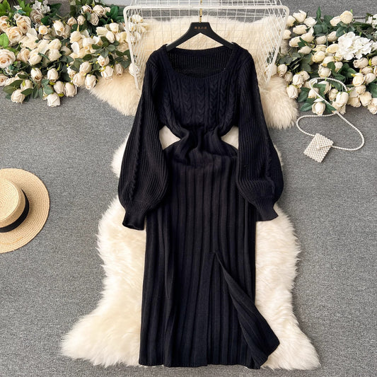Sweater Dress Women's High-Quality Square Neck Puff Sleeve Knitted Skirt S4615