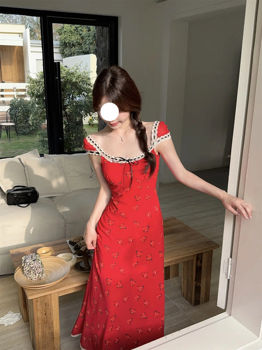 Tea break French floral dress 2025 new slim retro red holiday style long skirt R0045