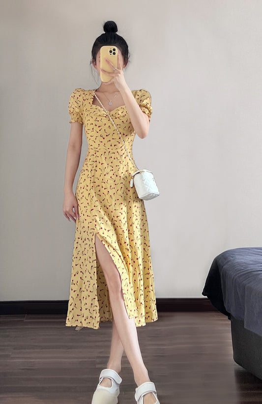 Tea break French dress new yellow square neck puff sleeves slit long skirt waist slimming skirt R0055