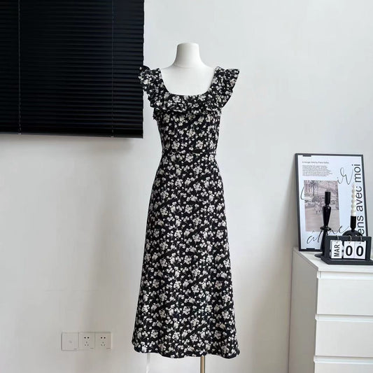 Tea break dress 2025 new dating rose island floral black dress medium-length ruffled skirt R0179