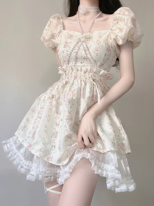 Tea break French floral dress 2025 new design niche sweet puff sleeve princess puffy skirt R0175