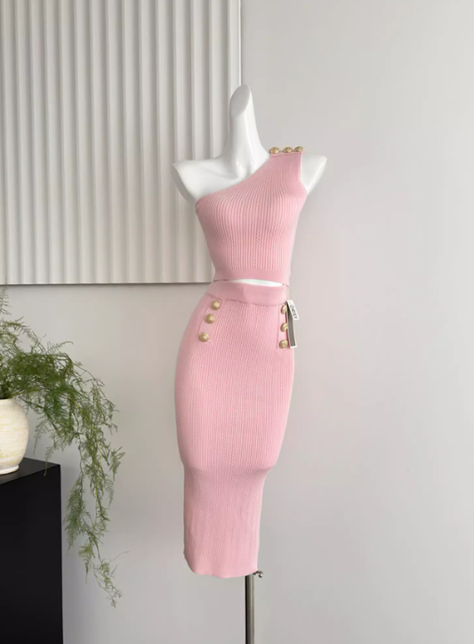 Temperament pure pink gold button off-shoulder short knitted versatile top slim skirt fashion suit R0277