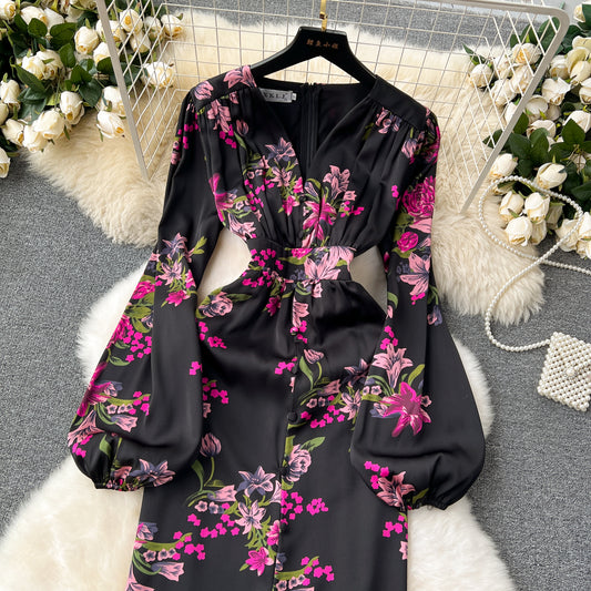 Temperamental and elegant dress 2025 new waist lantern sleeves printed dress long skirt R2246