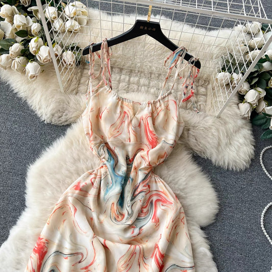 Tie Dye Printed Dress, Halter Dress, Waist Slimming Chiffon Holiday Dress S4481