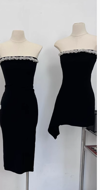 Tube top design fishtail hem A-line dress women's waist dress little black dress R3149