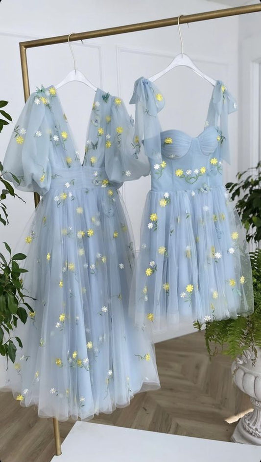 Turquoise floral suspenders low-cut sexy waist slim short skirt homecoming dress R3780