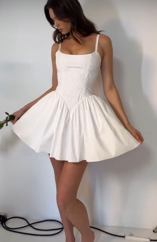 White suspender embroidery waist slim A-line short skirt homecoming dress R3858