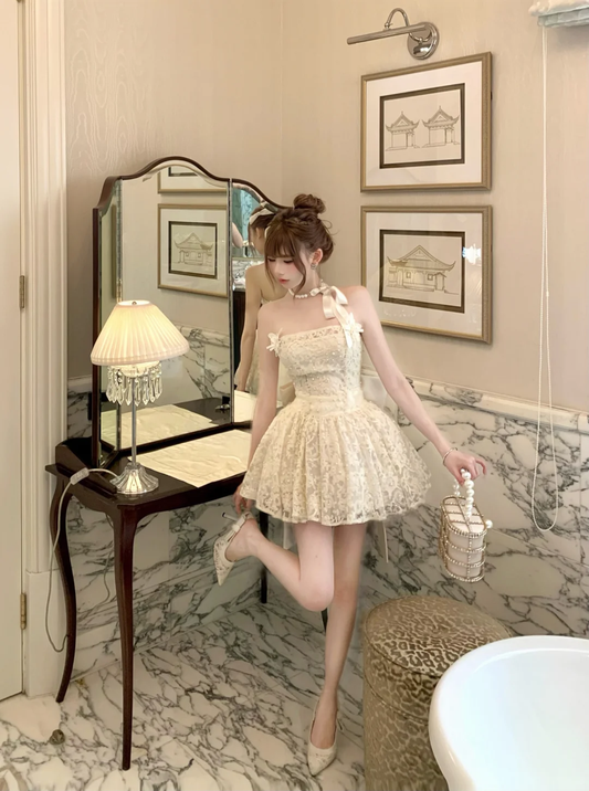 White tube top refreshing waist slim fit elegant three-dimensional skirt short skirt homecoming dress R4671