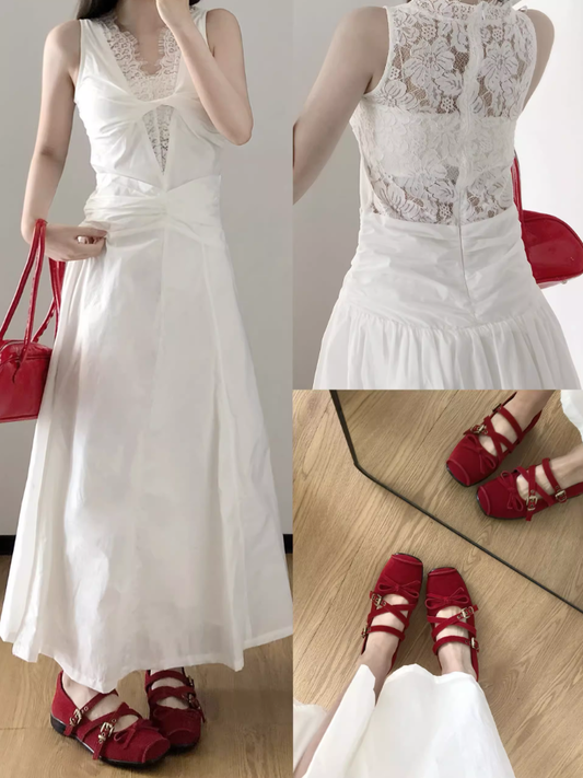 White v-neck lace dress is a niche style, beautiful waist temperament long skirt R0466