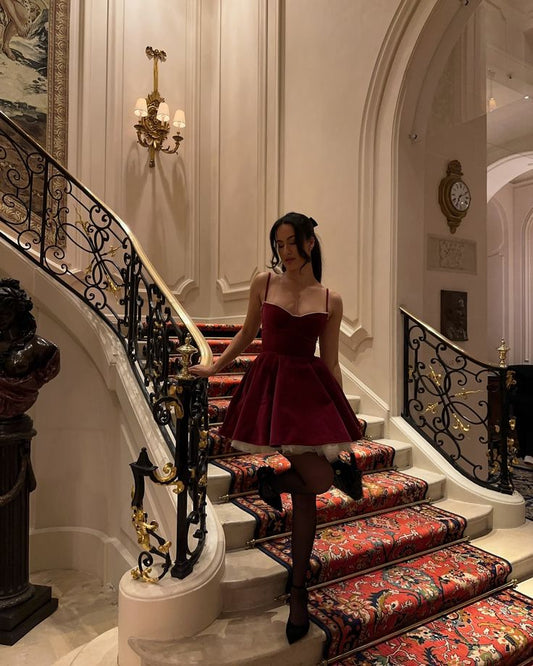 Red elegant A-line short skirt sexy suspenders V-neck slim dress homecoming dress R2437
