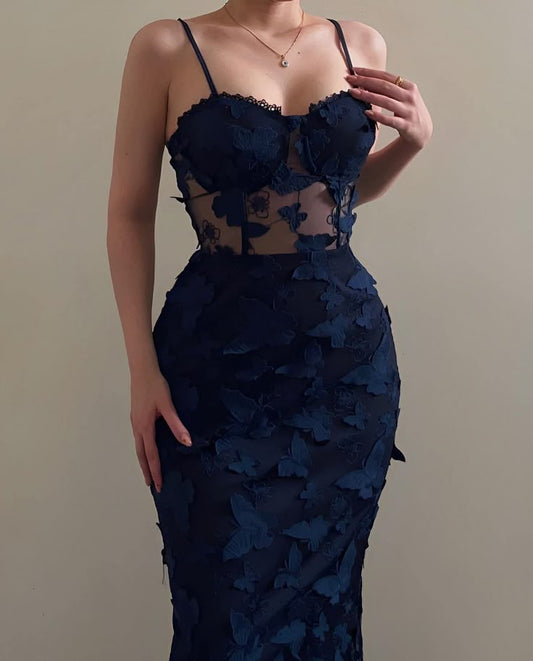 Vintage Mermaid Straps Birthday Party Dresses Navy Blue Lace Prom Dresses S7147