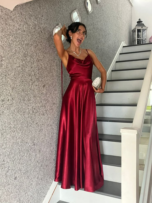 Spaghetti Straps Sleeveless A Line Satin Long Prom Dresses S7136